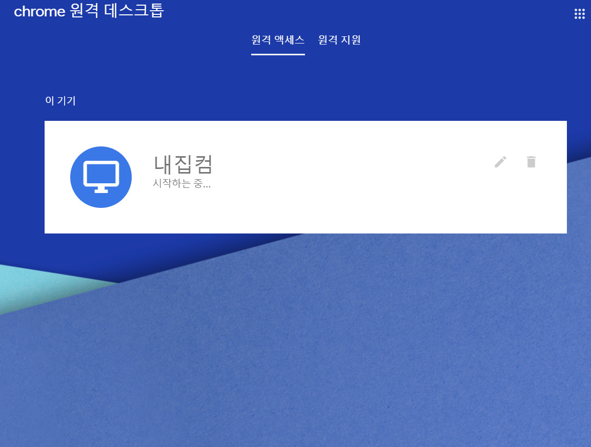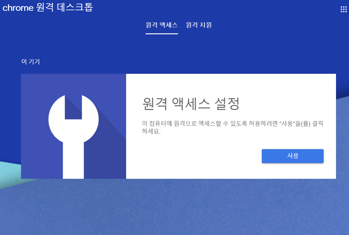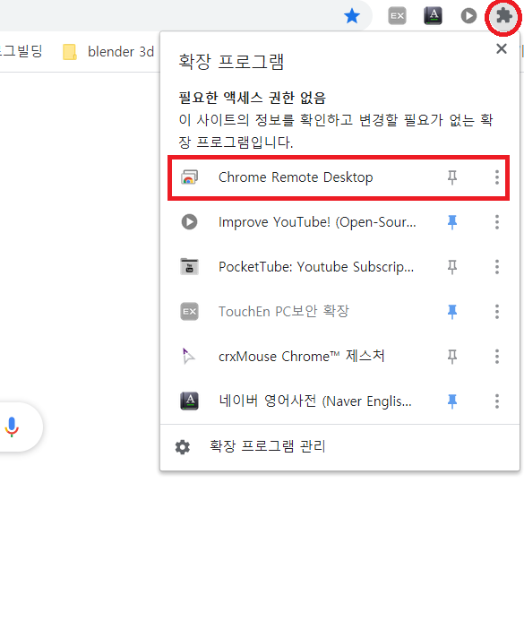크롬 브라우저에서 확장프로그램을 눌러 원격데스크톱 화면으로 가자. 아래의 빨간 표시된 '원격지원'을 클릭해보자.