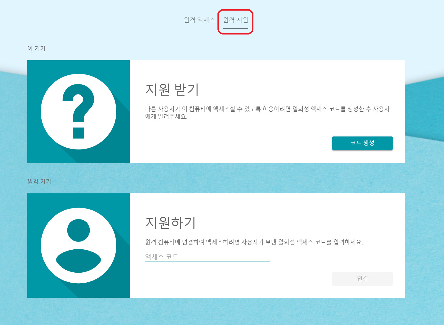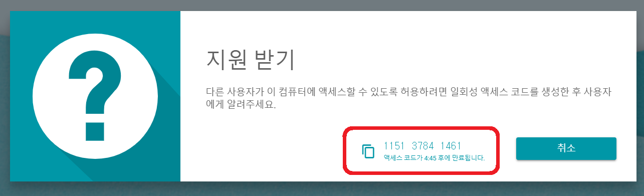 지원 받기는 남이 내 컴퓨터에 접속하는 것. [코드생성]이라는 버튼을 눌러보자. 아래와 같이 자동으로 비밀번호를 만들어낸다.