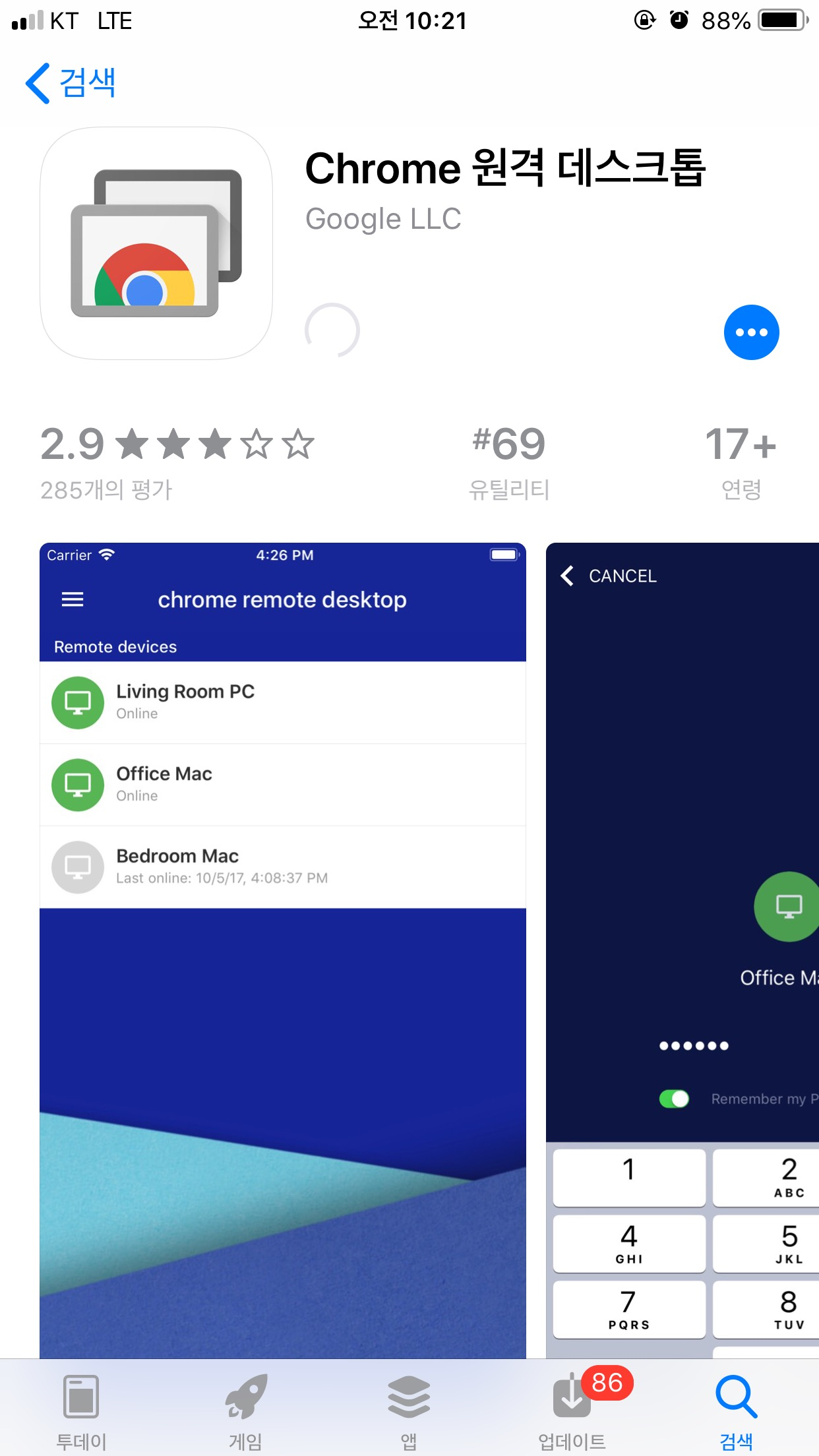 방법은 안드로이드와 ios가 동일하다. 앱스토어나 플레이스토어에서 Chrome remote 라고 검색해보자.