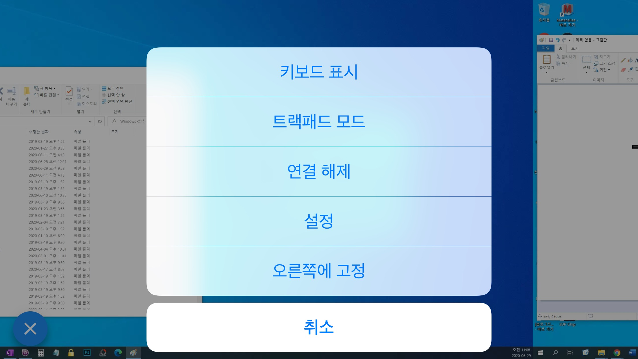 - 터치모드 : 내 손이 탭 한 그 자리에 클릭입력. 즉 뭔가를 실행하려면 아이콘을 바로 탭해야 한다. 직관적인 것이 장점. 그런데 더블클릭 입력이 잘 안되는 것이 단점. 2손가락으로 터치하면 '오른클릭'으로 작동한다. 만일 파일을 드래그하고 싶다면, 파일을 터치한 상태에서 가만히 기다릴 것. 그럼 드래그 상태에 돌입했다는 '원'을 살짝 보여준다. 그 다음부터 드래그하면 파일을 끌어다 옮길 수 있다.