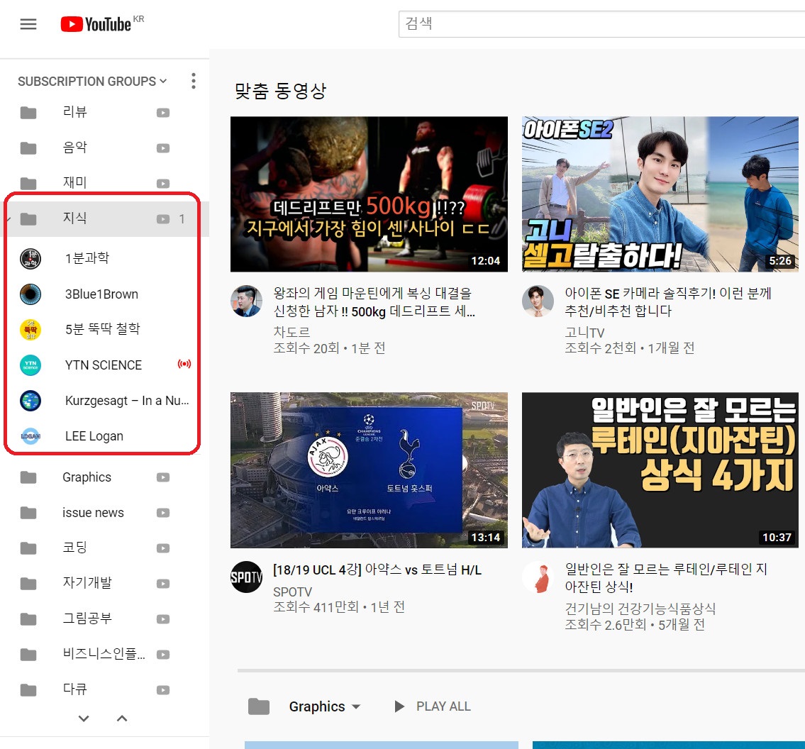 그리고 유투브에 접속을 해보면, 아래에 표시한 것과 같이 SUBSCRIPTION GROUPS라는 영역이 표시됩니다.