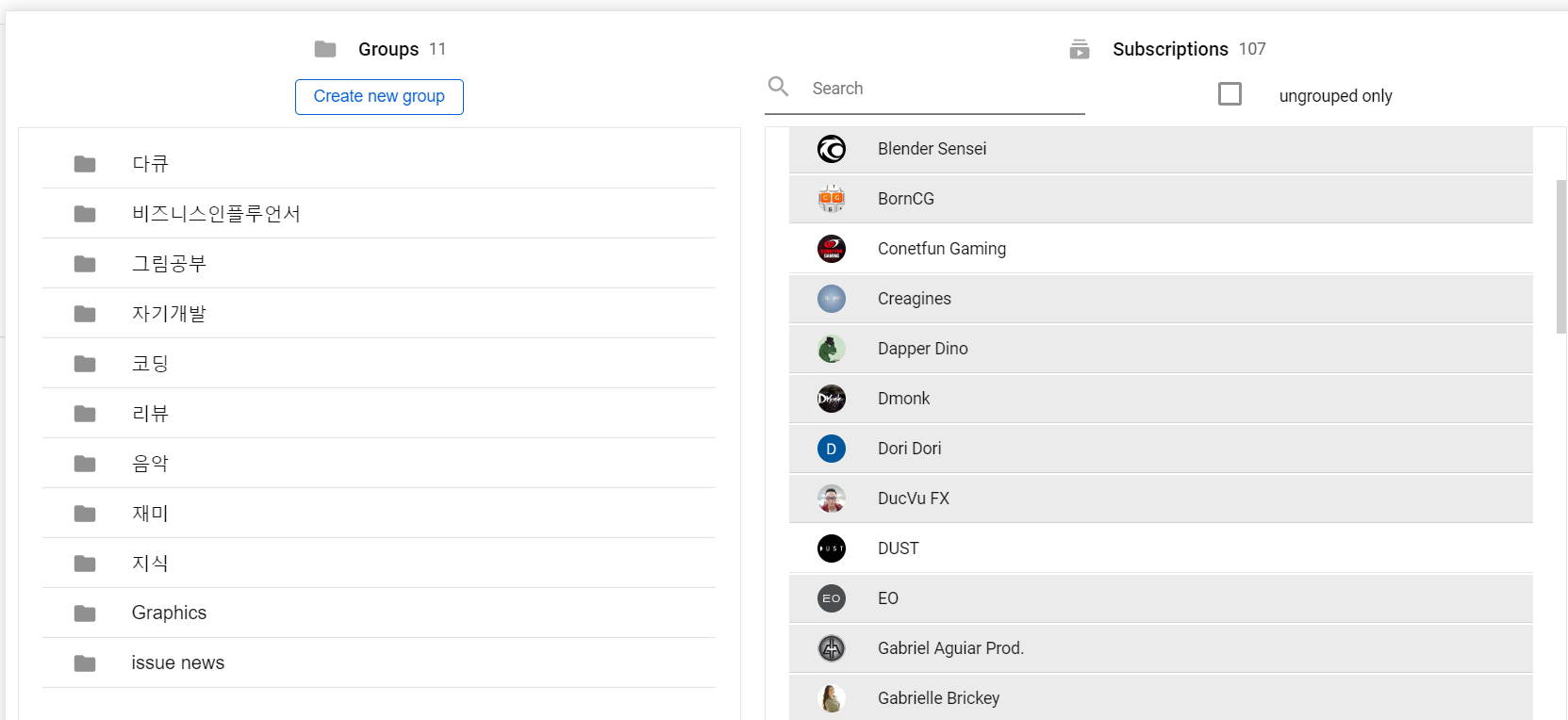 보니까 만들어진 Group는 없는 상태고, 구독은 107개 채널이라고 나오네요.